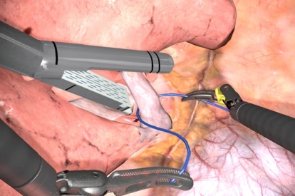 O assistente pode praticar habilidades laparoscópicas relevantes para o trabalho com o cirurgião robótico, tais como transferências de objetos, remoção de partes do campo operatório através dos trocartes assistentes, retração, sucção/irrigação, aplicação de clipe e grampeamento.
